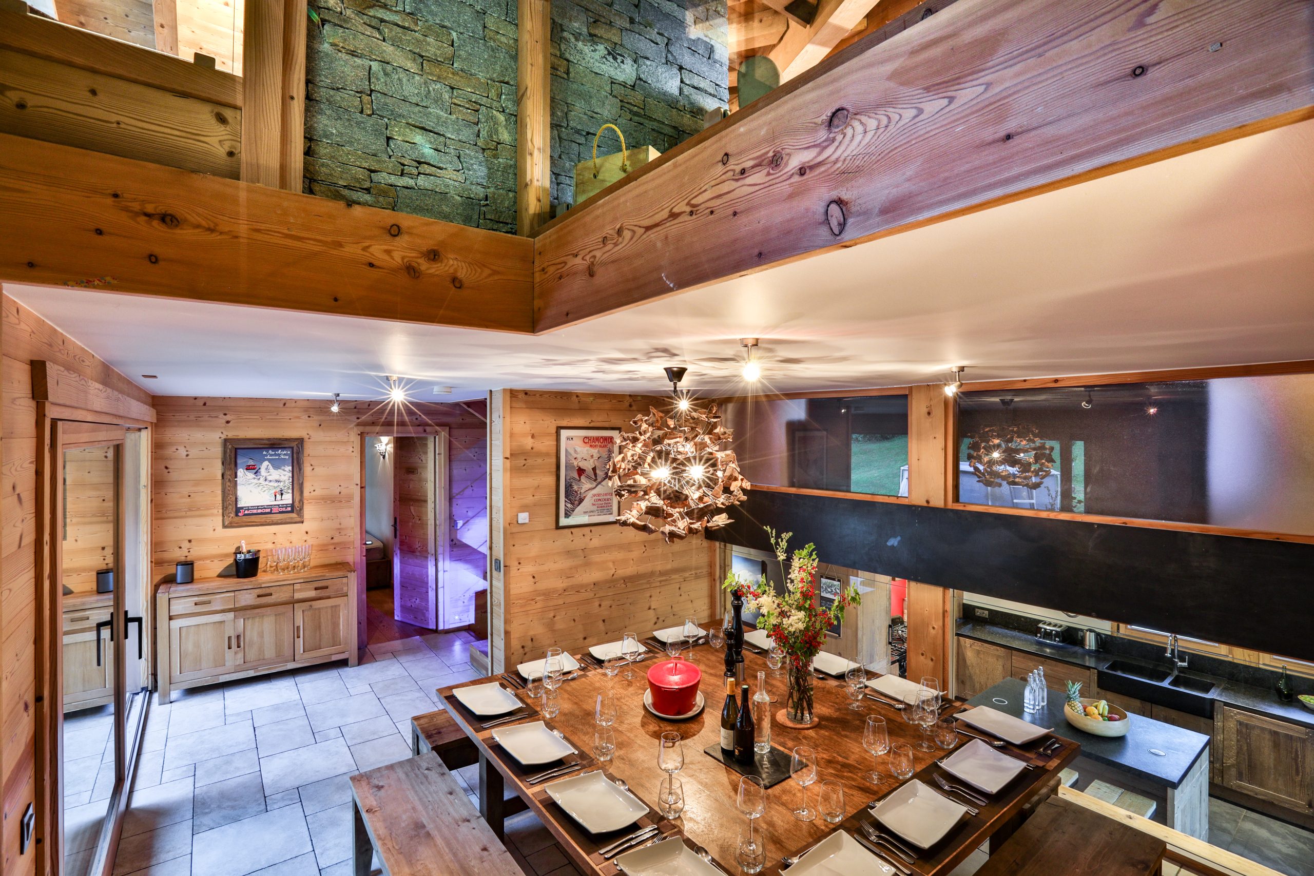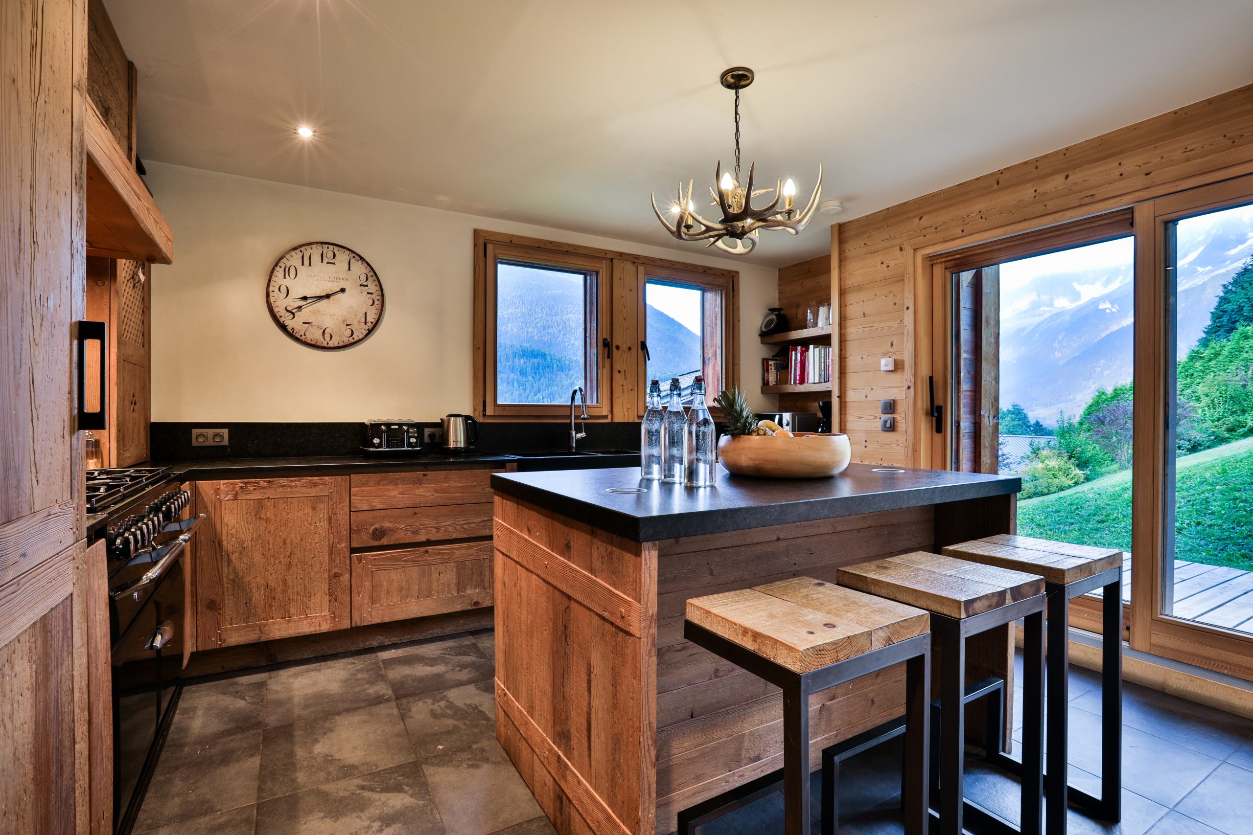 Espace bar : Le chalet dispose d’un espace confortable avec bar, près de la cheminée, avec vue sur la montagne. C’est l’endroit idéal pour déguster des cocktails après le ski.